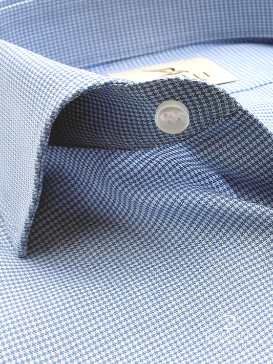 Camicia in Cotone Microfantasia Pied de Poule Bianca e Celeste Collo Francese