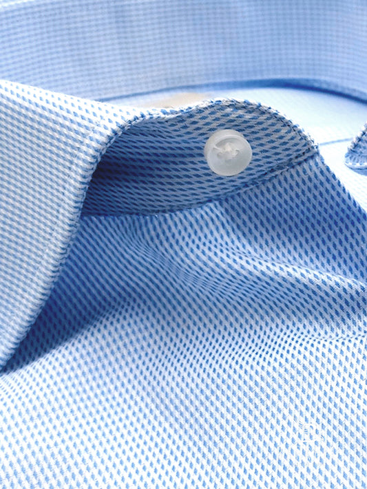 Camicia in Cotone Doppio Ritorto Fantasia Geometrica Celeste Fondo Bianco Collo Francese