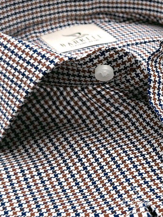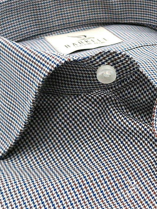 Camicia in Cotone Microfantasia Pied de Poule Blu e Marrone Collo Francese