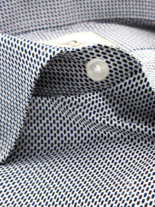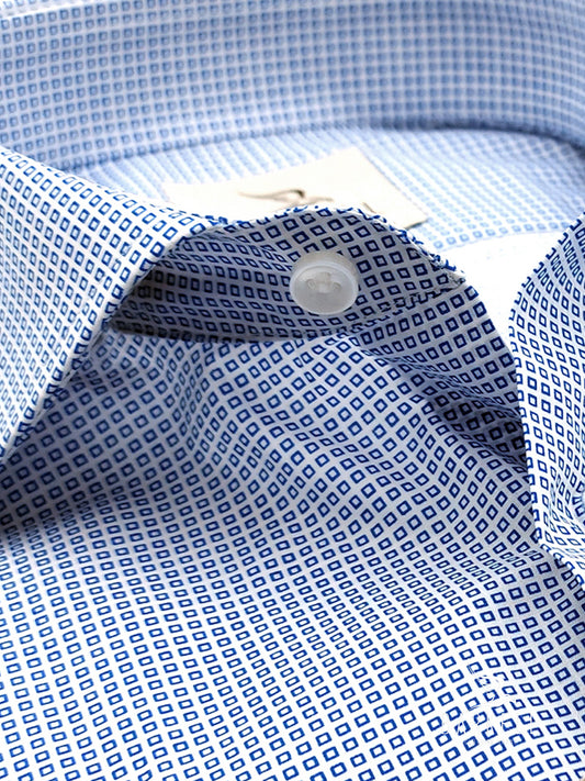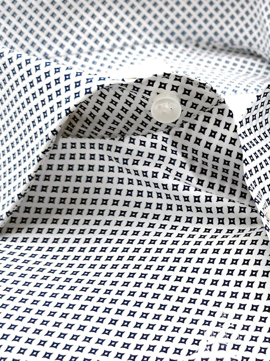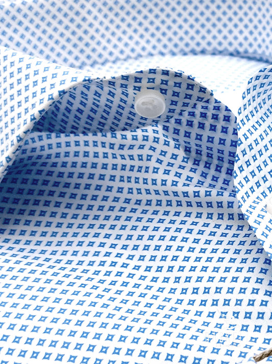 Camicia in Cotone Doppio Ritorto Fantasia Geometrica Blu Fondo Bianco Collo Francese