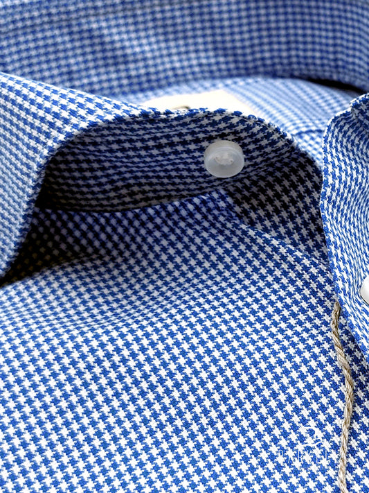 Camicia in Cotone No Stiro Microfantasia Pied de Poule Blu e Bianco Collo Francese