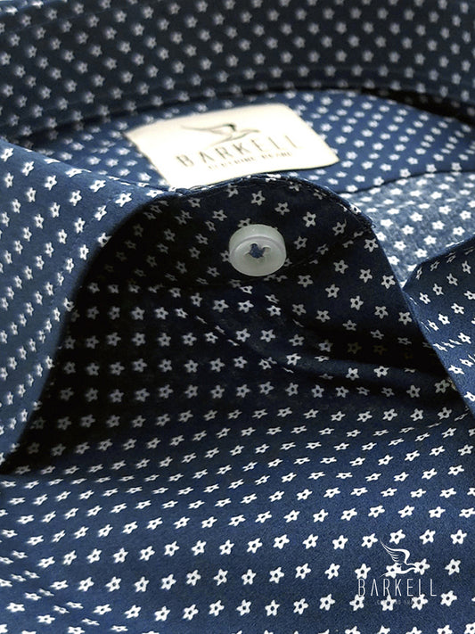 Camicia in Cotone Fantasia Fiorellino bianco Fondo Blu Collo Francese