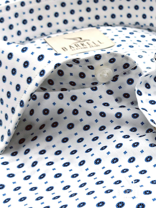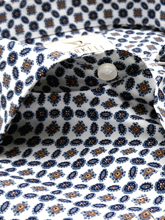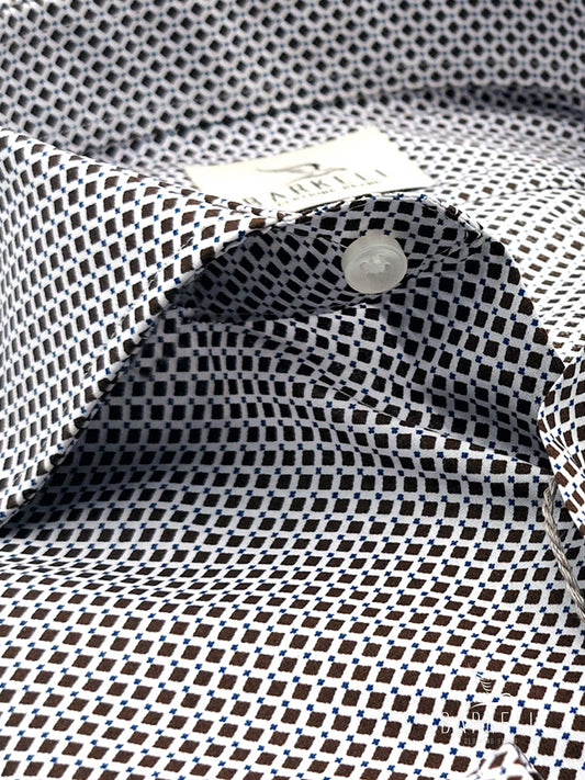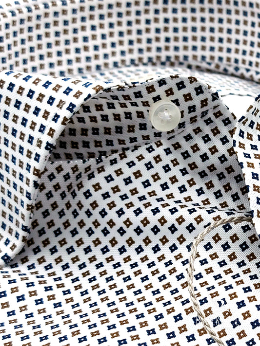 Camicia in Cotone Fantasia Geometrica Blu e Marrone Fondo Bianco Collo Francese