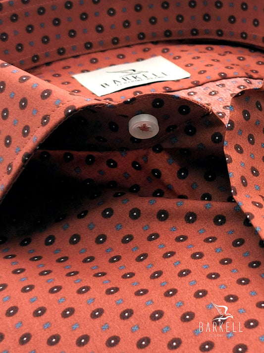 Camicia in Cotone Fantasia Geometrica Marrone Fondo Mattone Collo Francese