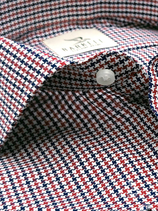 Camicia in Cotone Fantasia Pied de Poule Blu e Rosso Collo Francese