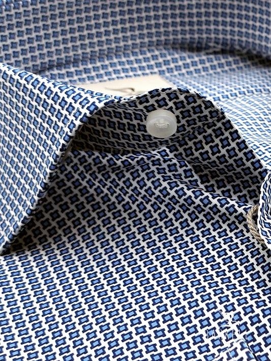 Camicia in Cotone Fantasia Geometrica Blu Fondo Bianco Collo Francese