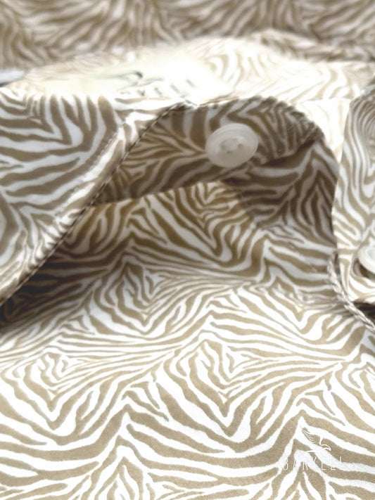 Camicia in Cotone Fantasia Safari Bianco Fondo Sabbia Collo Francese Piccolo