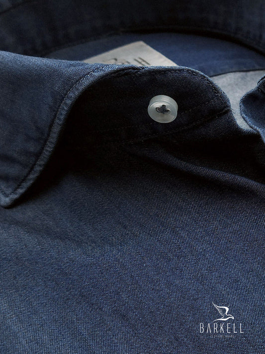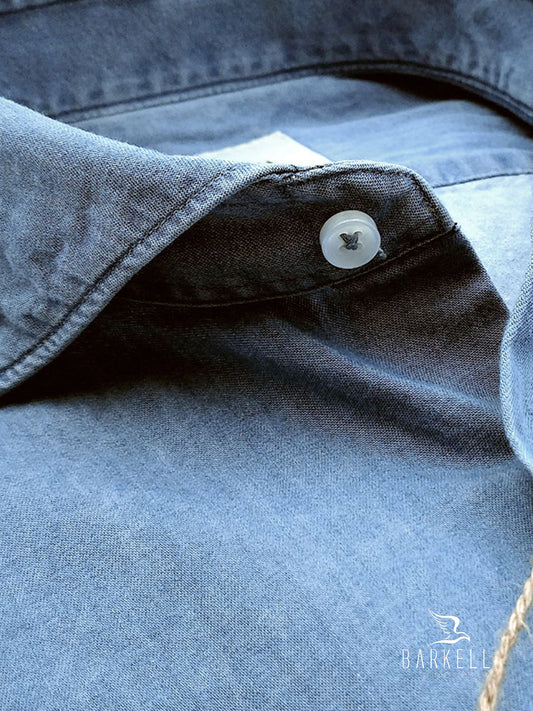 Camicia in Cotone Denim Lavato Color Jeans Medio Collo Francese Cutaway