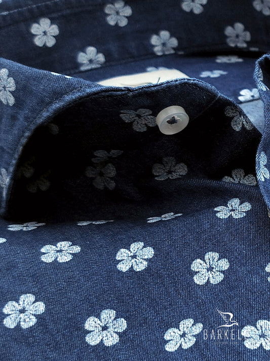 Camicia in Jeans Fantasia Fiorata Coloniale Fondo Stone Denim Medio Collo Francese Cutaway