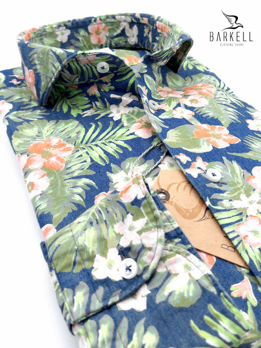 Camicia in Jeans Fantasia Fiori Tropicali Multicolore Fondo Stone Denim Medio Collo Francese Cutaway