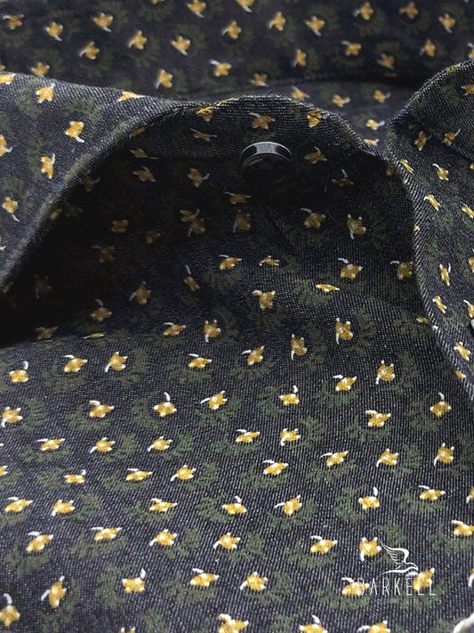 Camicia in Jeans Fantasia Floreale Ocra Fondo Black Denim Collo Francese Cutaway