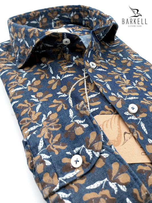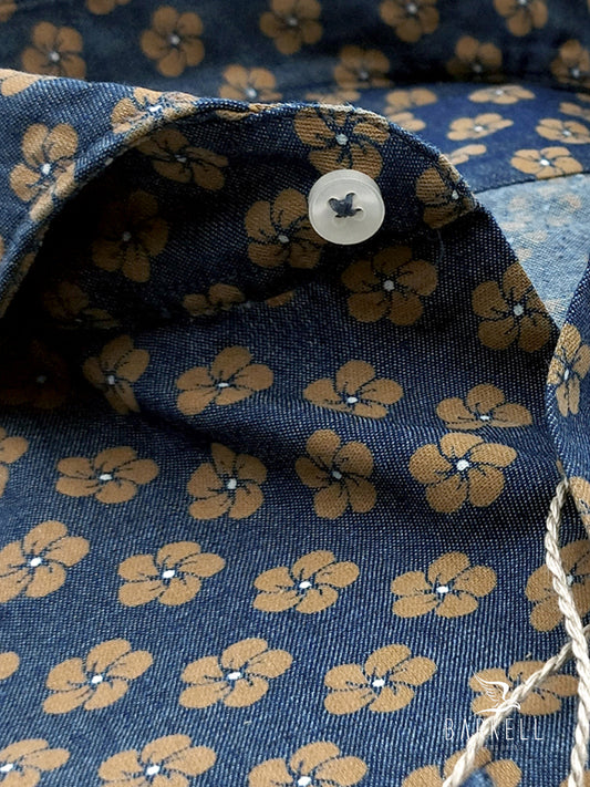 Camicia in Jeans Fantasia Fiore Nocciola Fondo Stone Denim Medio Collo Francese Cutaway