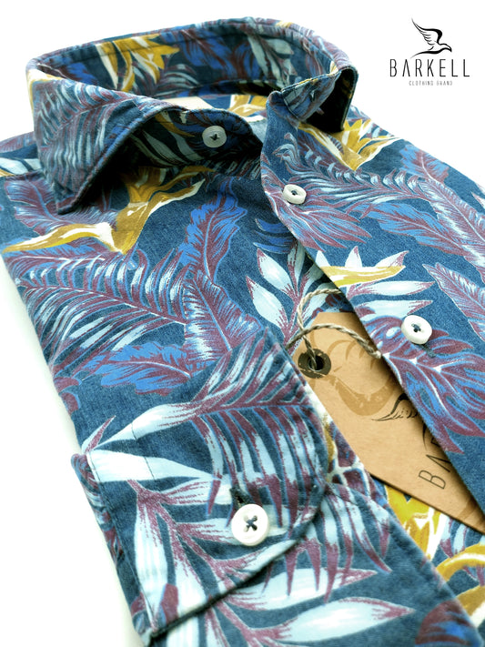 Camicia in Jeans Fantasia Palme Tropicali Multicolore Fondo Stone Denim Medio Collo Francese Cutaway