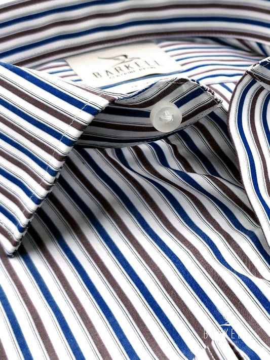 Camicia in Cotone No Stiro Rigata Blu e Marrone Fondo Bianco Collo Francese