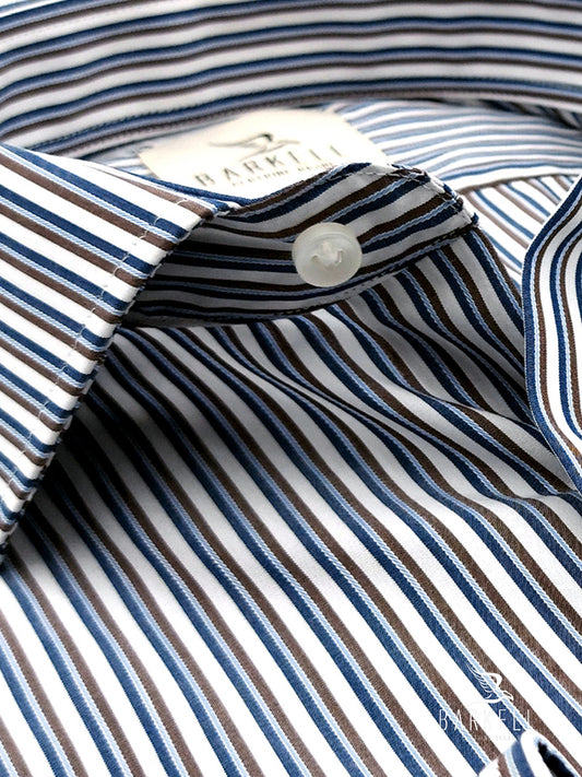 Camicia in Cotone No Stiro Rigata Marrone e Indaco Fondo Bianco Collo Francese