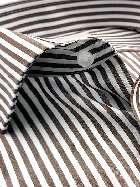 Camicia in Cotone No Stiro Rigata Marrone e Bianco Collo Francese