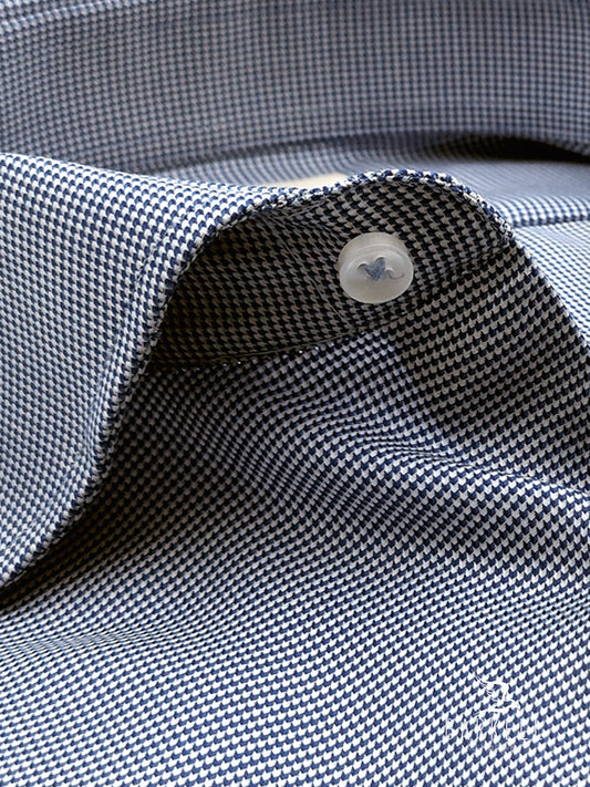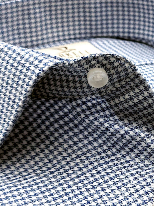 Camicia in Cotone No Stiro Microfantasia Pied de Poule Blu e Bianco Collo Francese