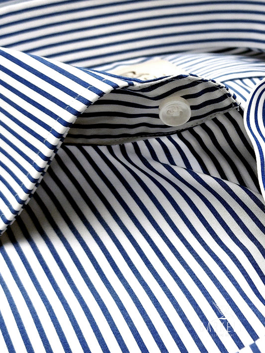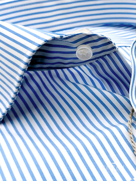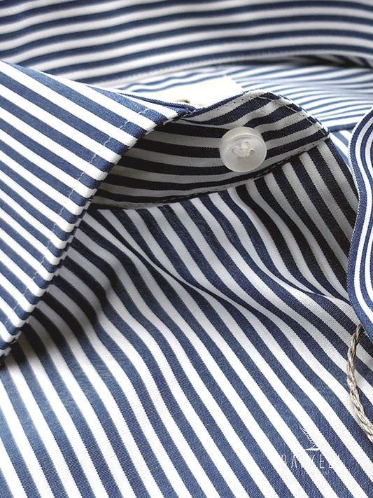 Camicia in Cotone No Stiro Rigata Bianca e Blu Collo Francese