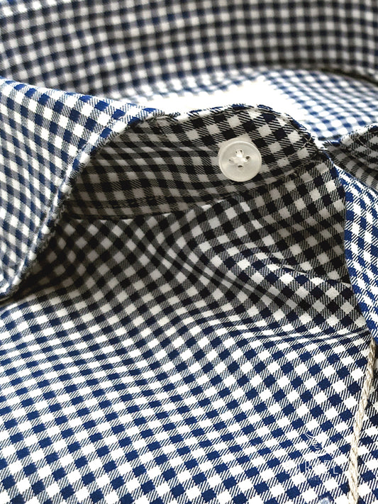 Camicia in Cotone Flanellato Quadretto Blu Denim Fondo Bianco Collo Francese Cutaway
