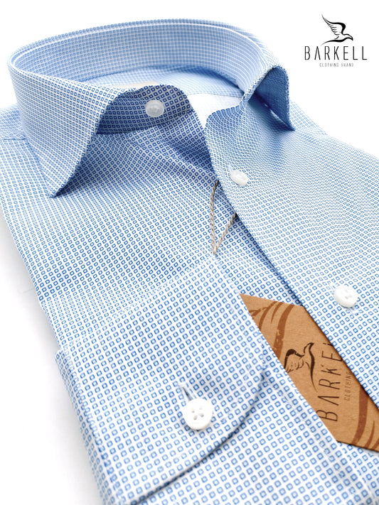 Camicia in Cotone Fantasia Geometrica Celeste Fondo Bianco Collo Francese