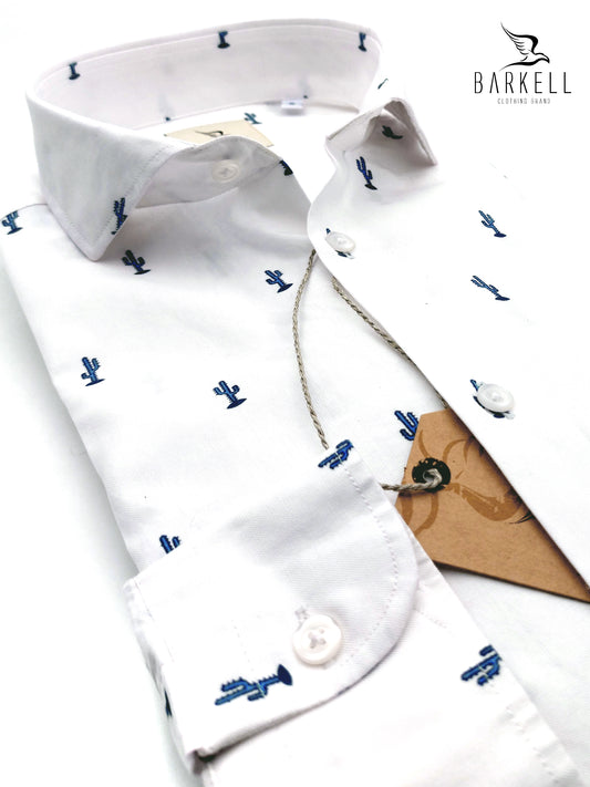 Camicia in Cotone Oxford Pinpoint Fantasia Cactus Blu Fondo Bianco Collo Francese Spread