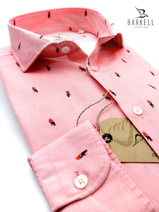 Camicia in Cotone Oxford Pinpoint Fantasia Pappagallino Multicolor Fondo Salmone Collo Francese Spread