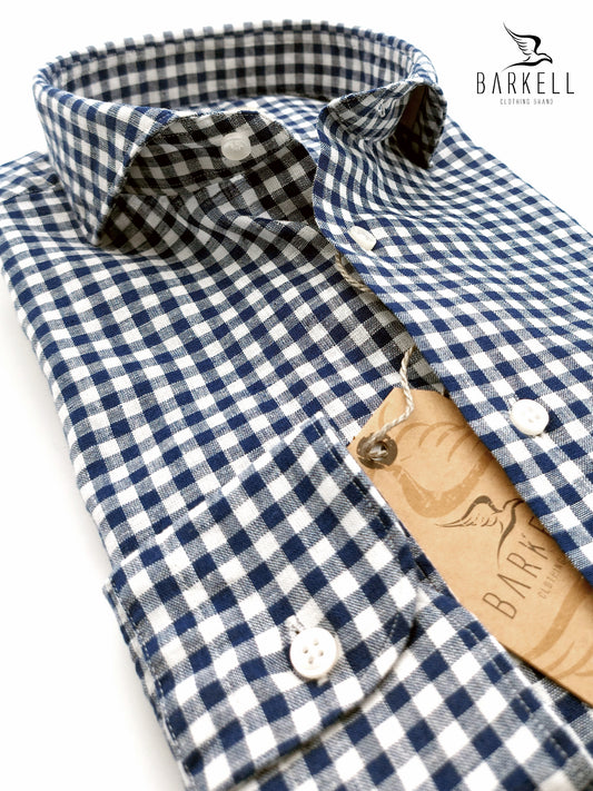 Camicia in Misto Lino Quadro Blu e Bianco Collo Francese Cutaway
