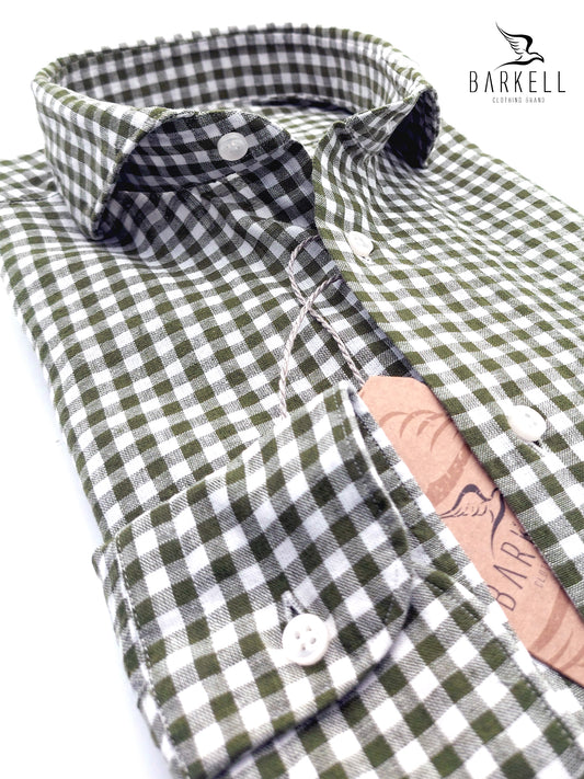 Camicia in Misto Lino Quadro Oliva e Bianco Collo Francese Cutaway