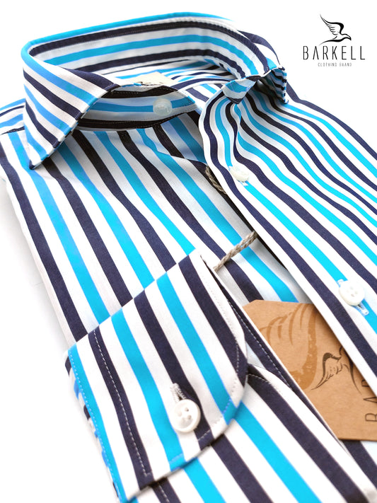 Camicia in Cotone Rigata Blu e Turchese Collo Francese Cutaway