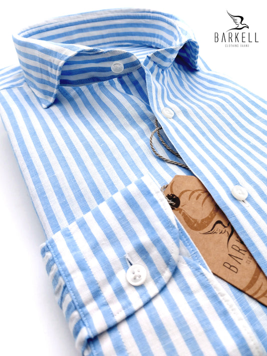 Camicia in Misto Lino Rigato Celeste e Bianco Collo Francese Cutaway