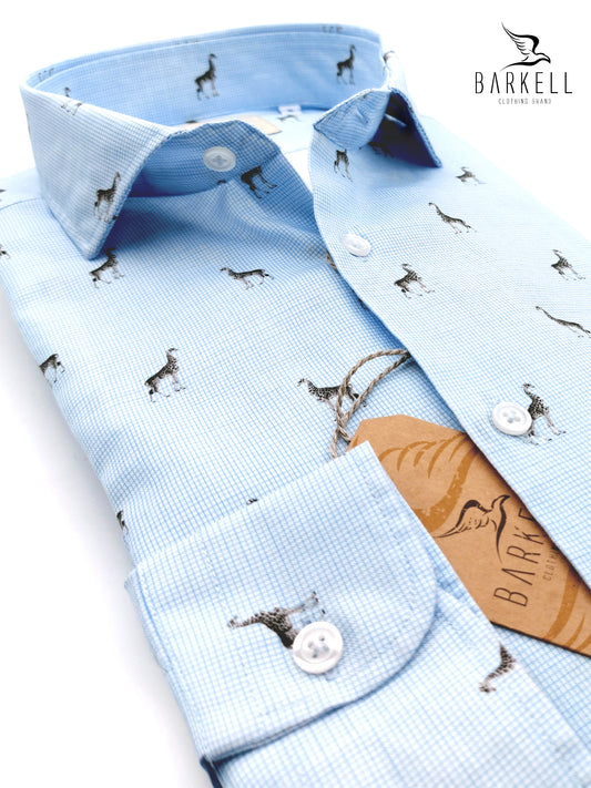 Camicia in Cotone Oxford Pinpoint Fantasia Quadretto e Giraffa Fondo Celeste Collo Francese Spread