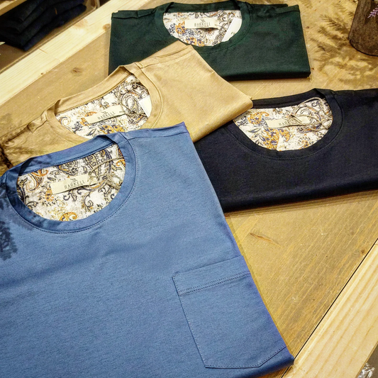 T-Shirt Girocollo con Taschino in Misto Filo di Scozia Color Blu