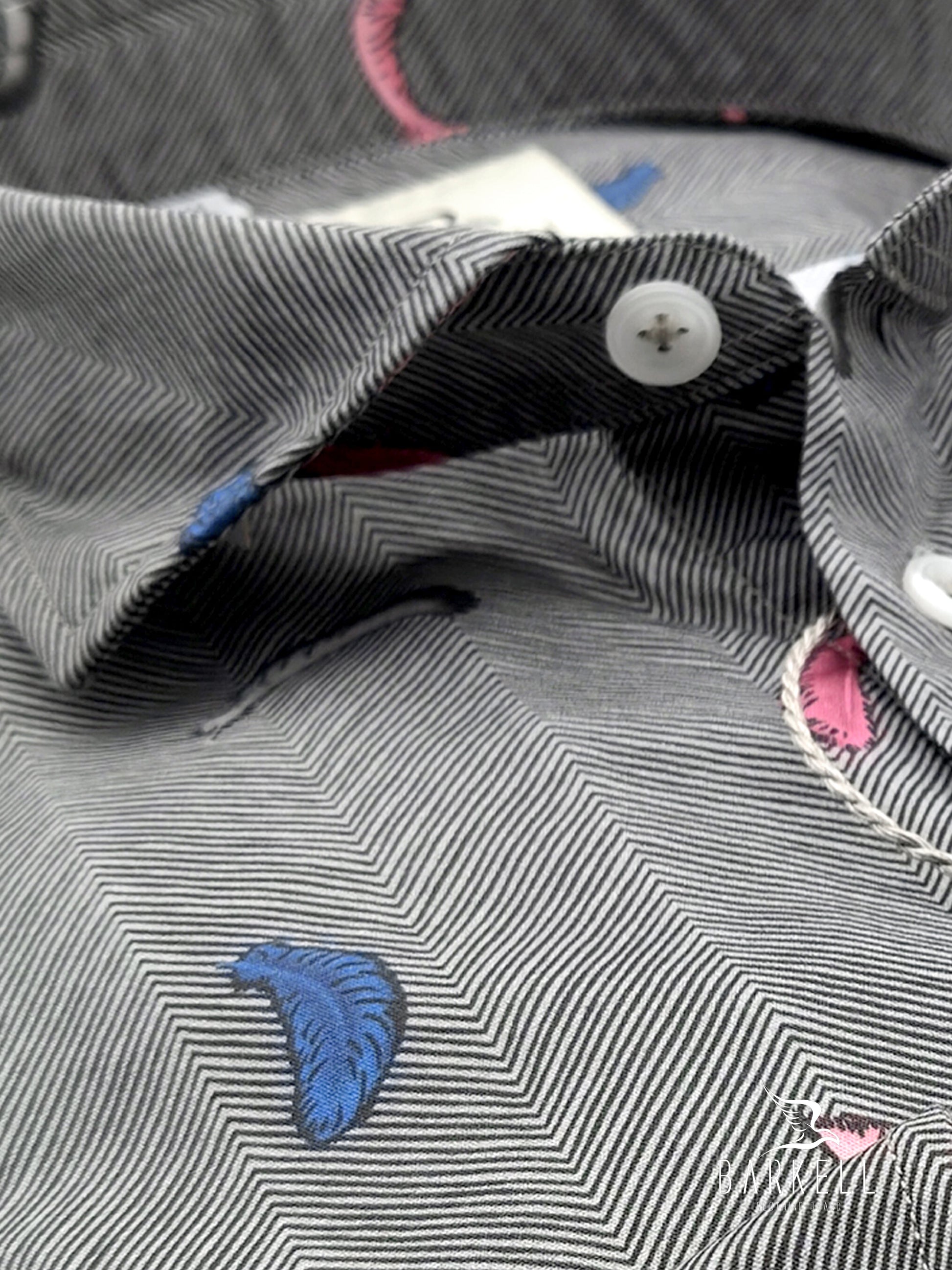Shirt with Fuchsia and Light Blue Feather Pattern on a Gray Background made in 100% Cotton Poplin fabric e Garment washed to give it a pleasant, naturally lived-in effect.