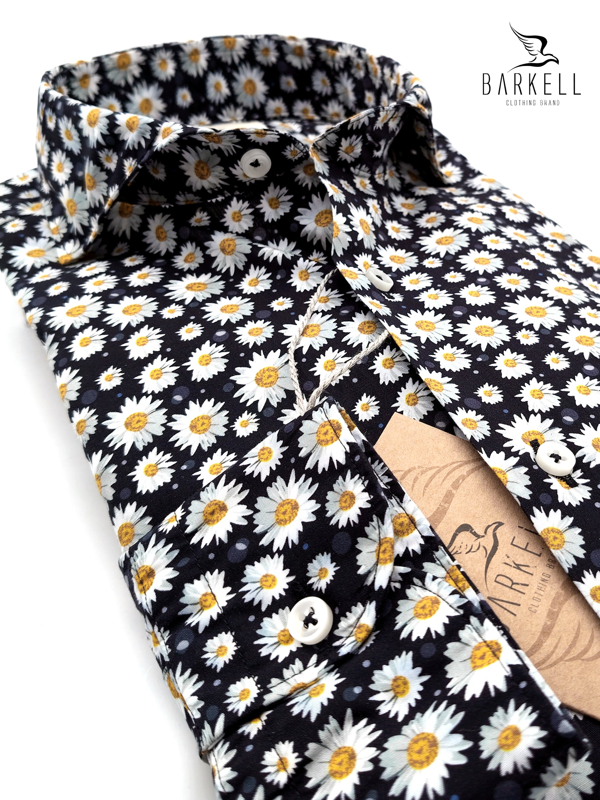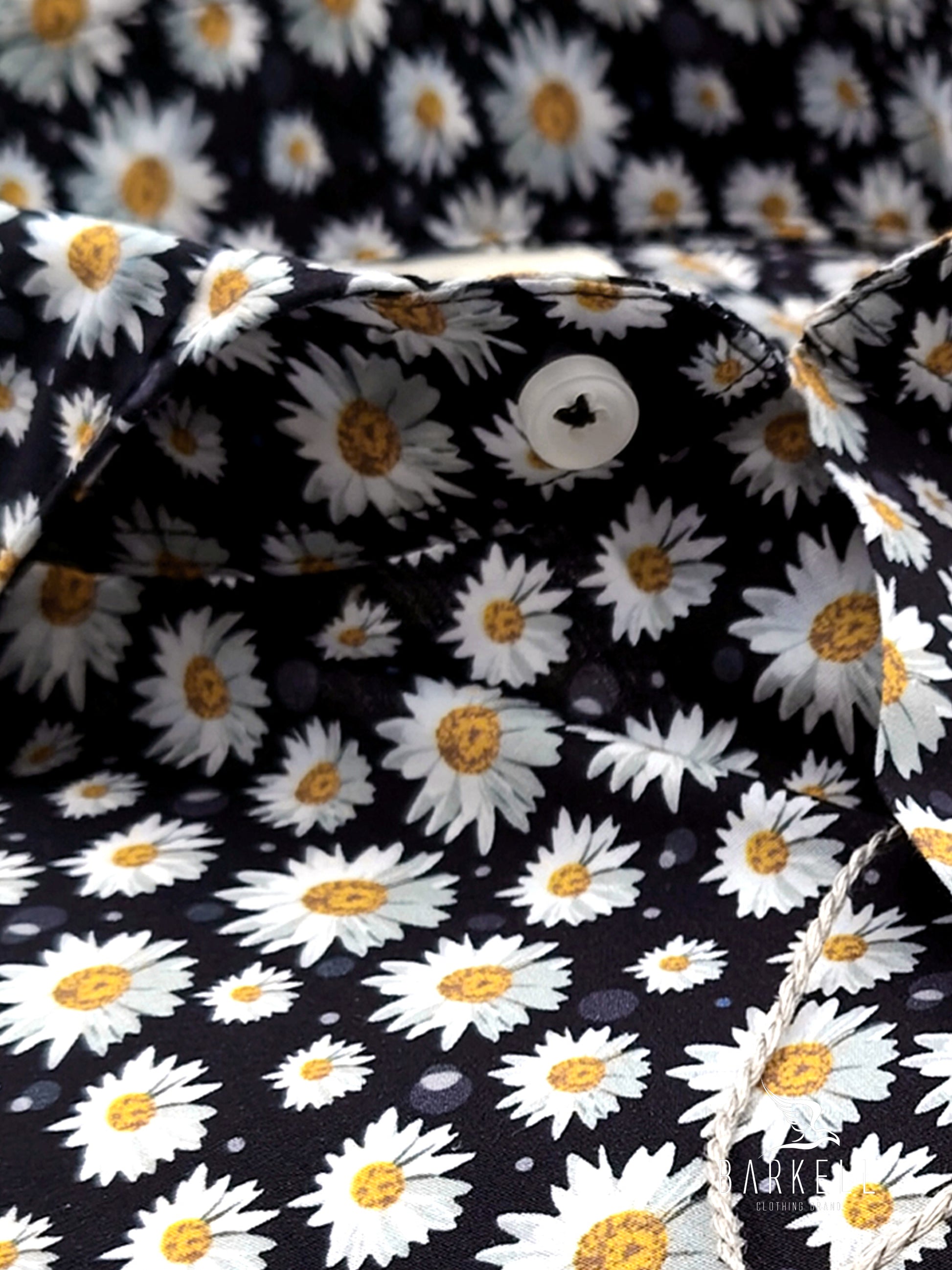 Camisa con estampado de margaritas sobre fondo negro hecho en Tejido popelín 100% algodón. mi Ropa lavada para darle un efecto agradable y natural.
