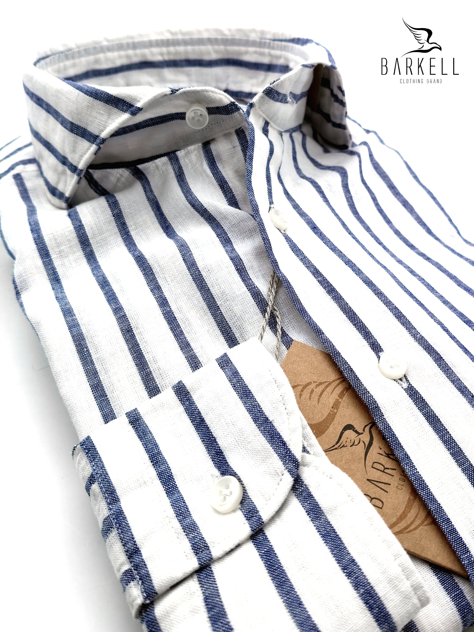 Camisa de mezcla de lino a rayas azules y blancas con cuello francés