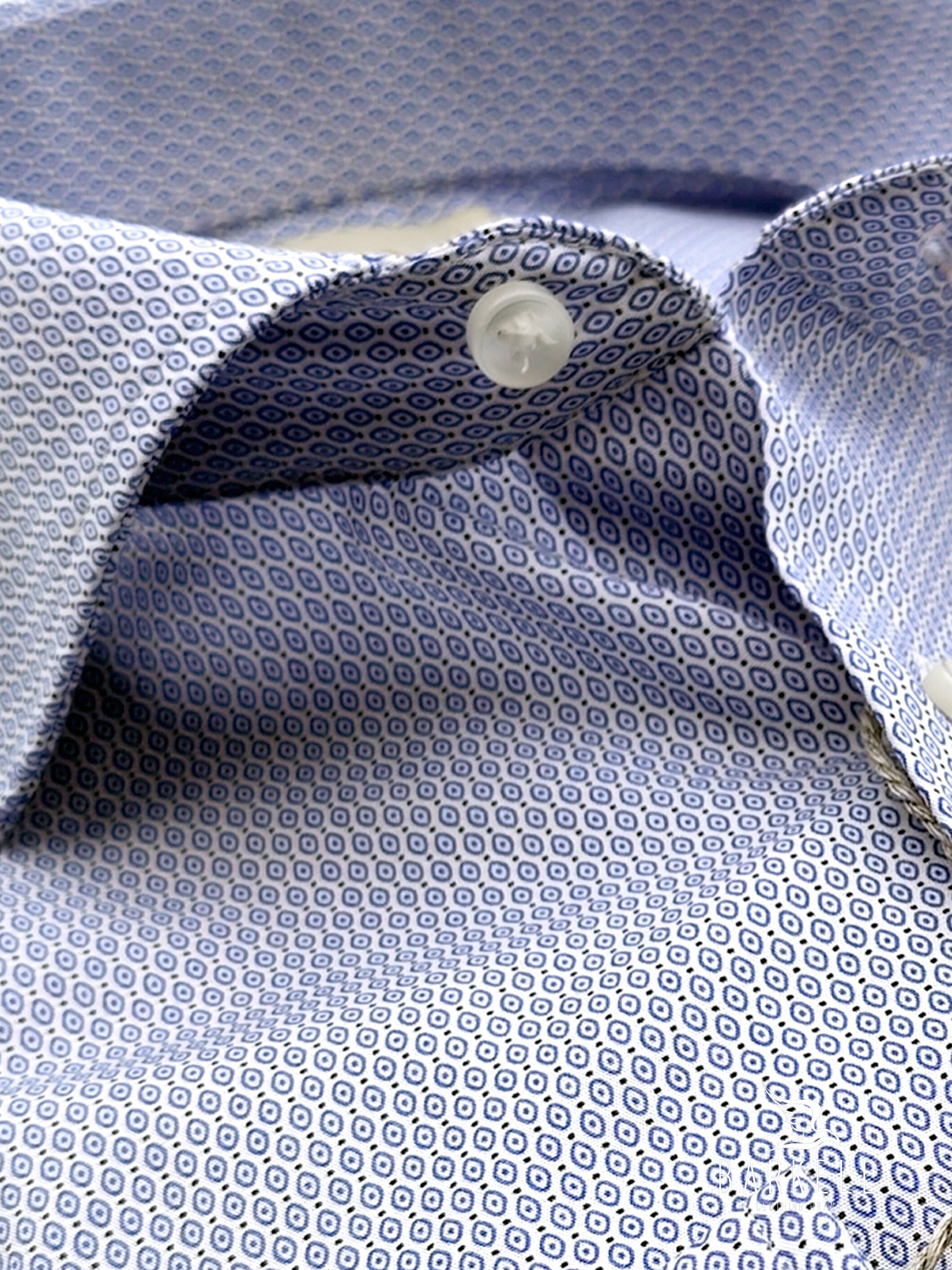 Camisa con micropatrón geométrico azul sobre fondo blanco. hecho en Tejido popelín 100% algodón no planchable.