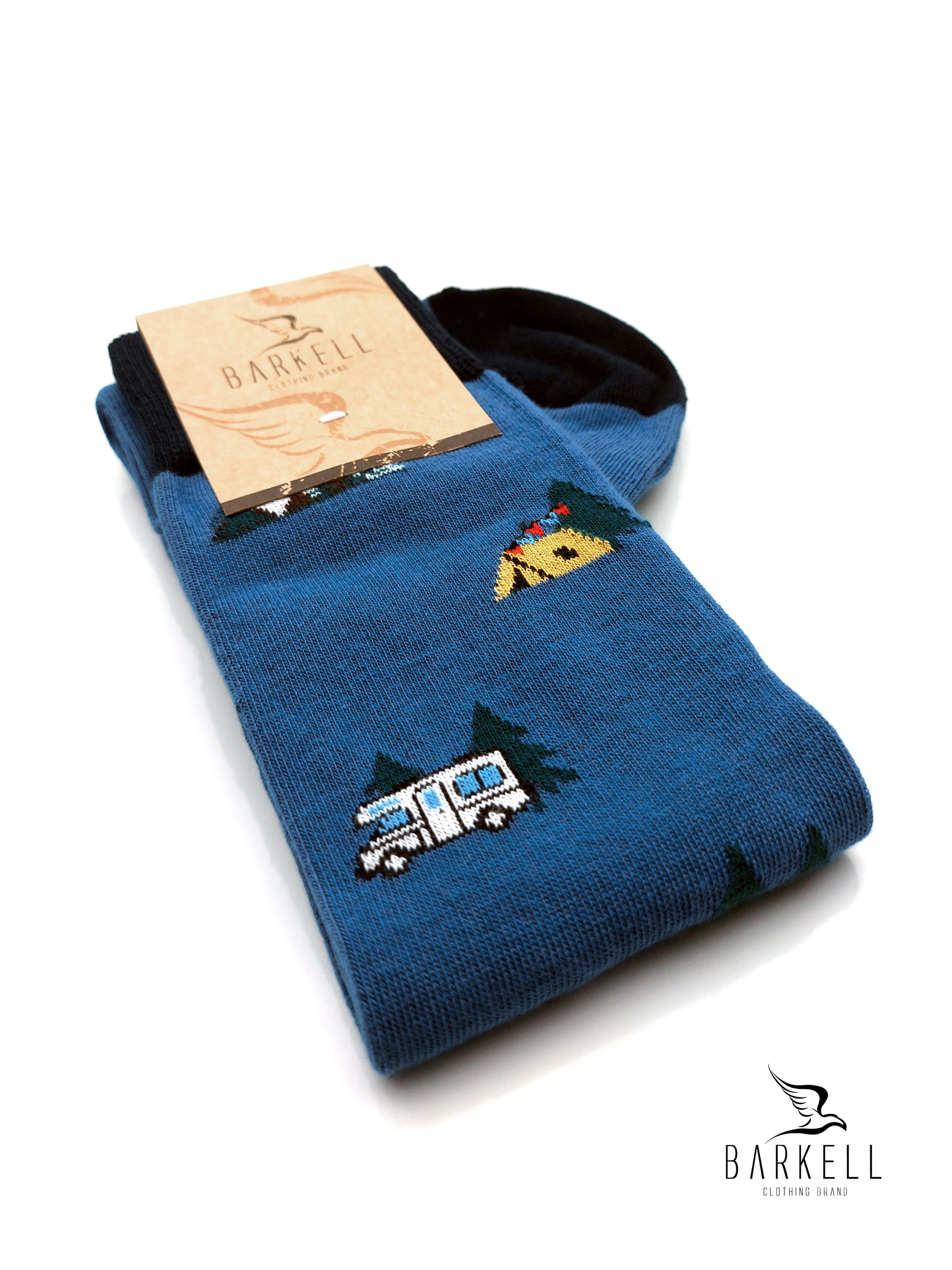 Calza Lunga Sotto il Ginocchio di Alta Qualità Made in Italy in 95% Cotone e 5% Elastan fondo Azzurro con fantasia Camping.