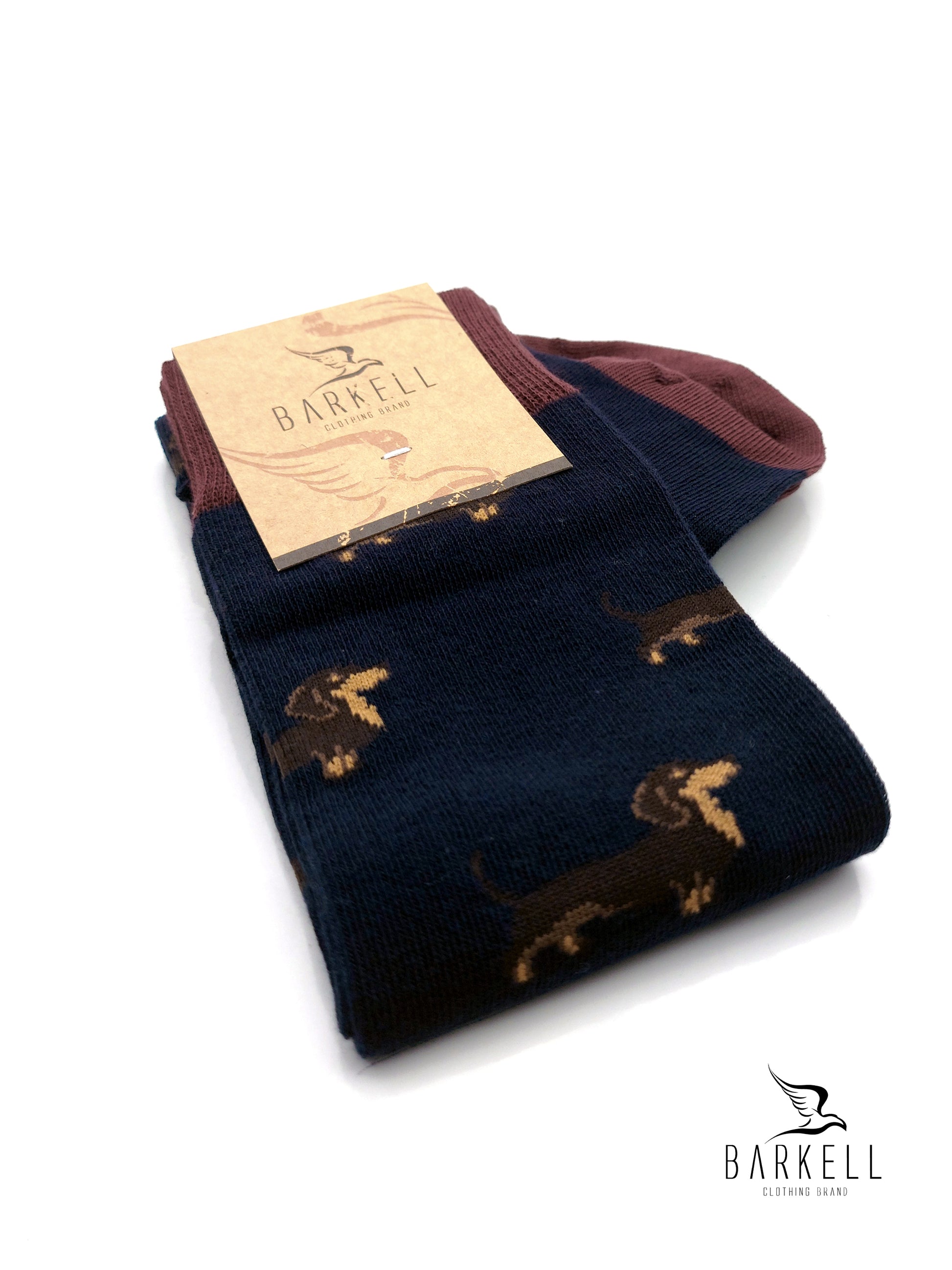 Calza Lunga Sotto il Ginocchio di Alta Qualità Made in Italy in 95% Cotone e 5% Elastan fondo Blu con fantasia Bassotto.