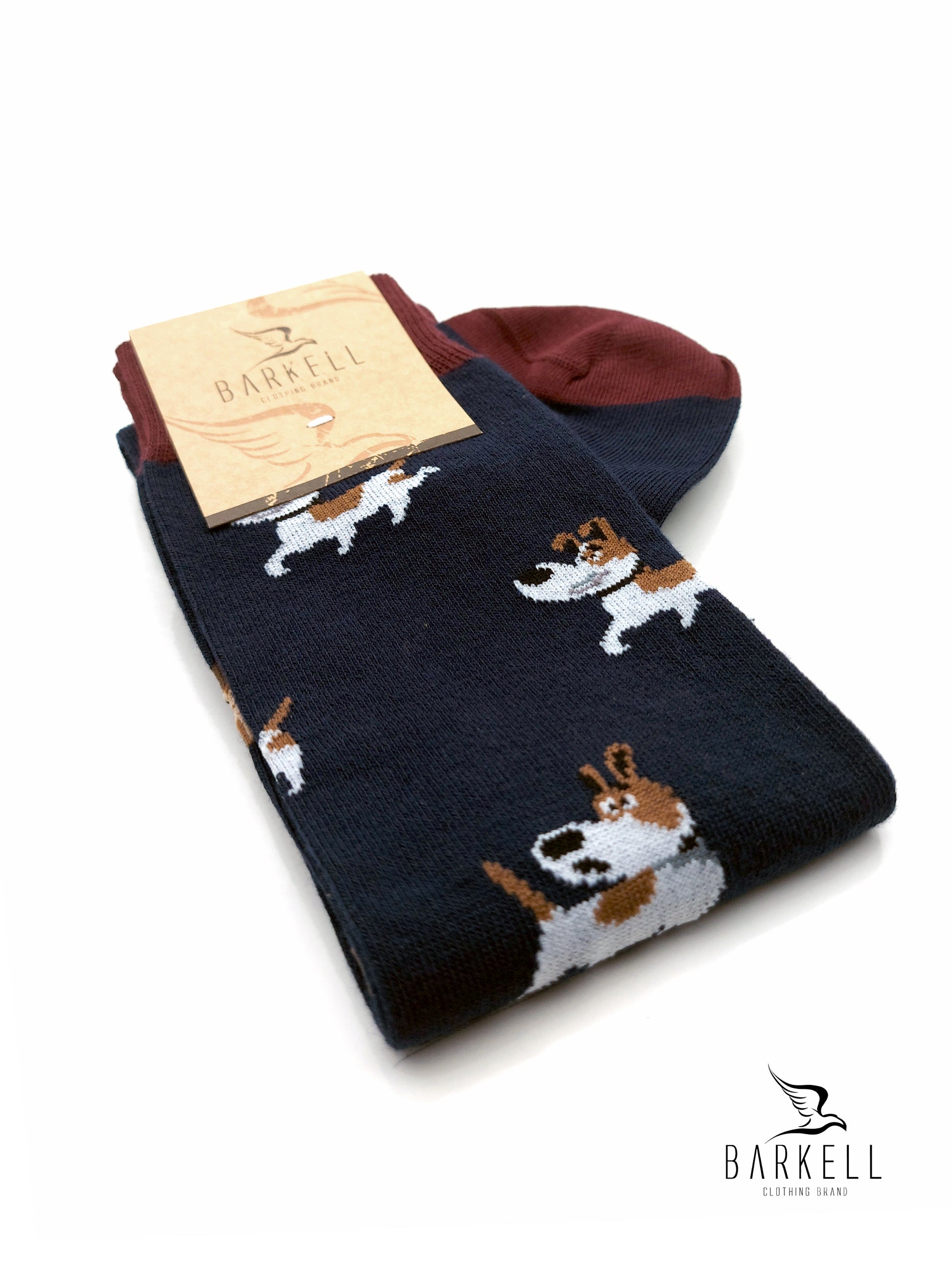 Calza Lunga Sotto il Ginocchio di Alta Qualità Made in Italy in 95% Cotone e 5% Elastan fondo Blu con fantasia Cane e Cuccia.