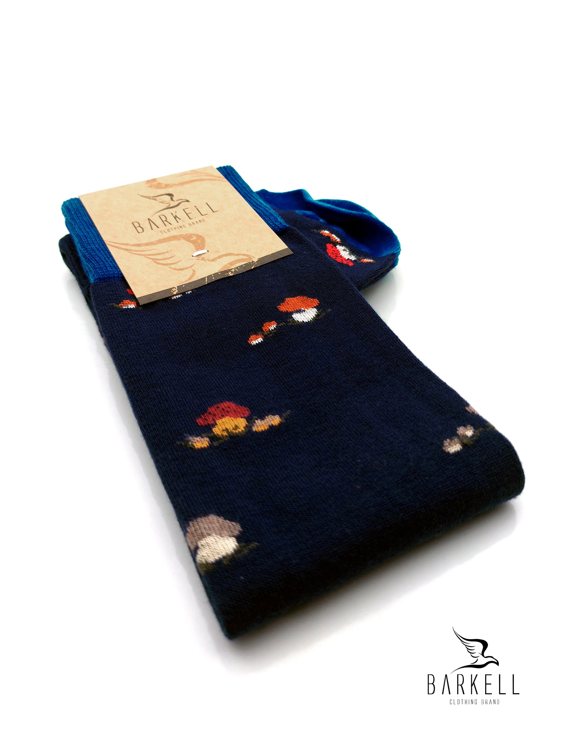 Calza Lunga Sotto il Ginocchio di Alta Qualità Made in Italy in 95% Cotone e 5% Elastan fondo Blu con fantasia Funghetti.