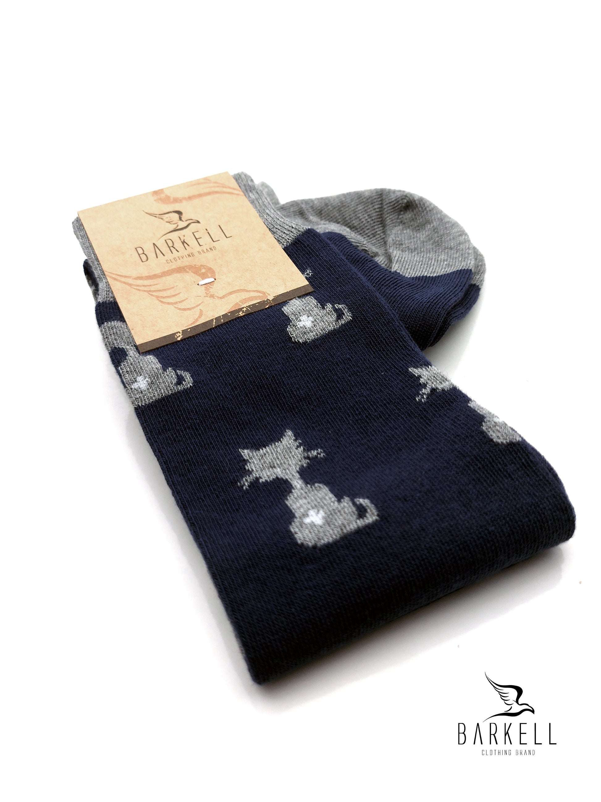 Calza Lunga Sotto il Ginocchio di Alta Qualità Made in Italy in 95% Cotone e 5% Elastan fondo Blu con fantasia Gatto e Zampa.