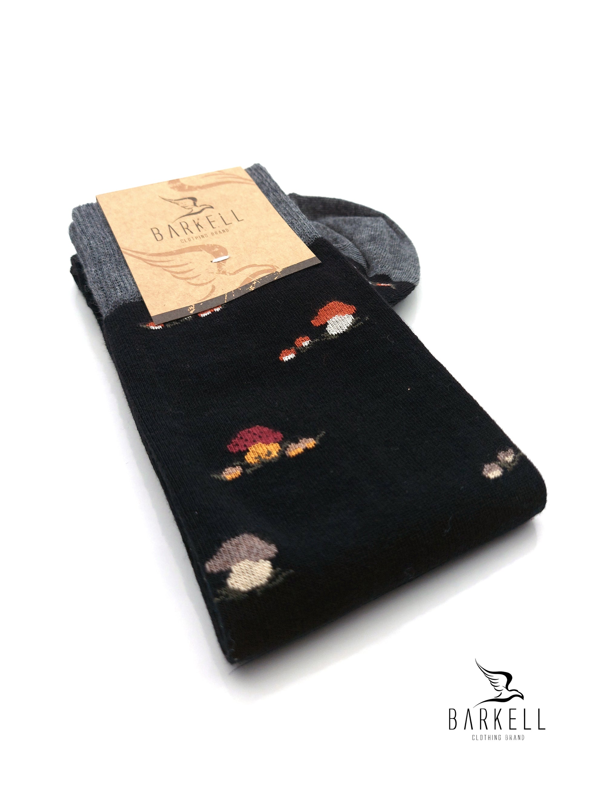Calza Lunga Sotto il Ginocchio di Alta Qualità Made in Italy in 95% Cotone e 5% Elastan fondo Nero con fantasia Funghetti.
