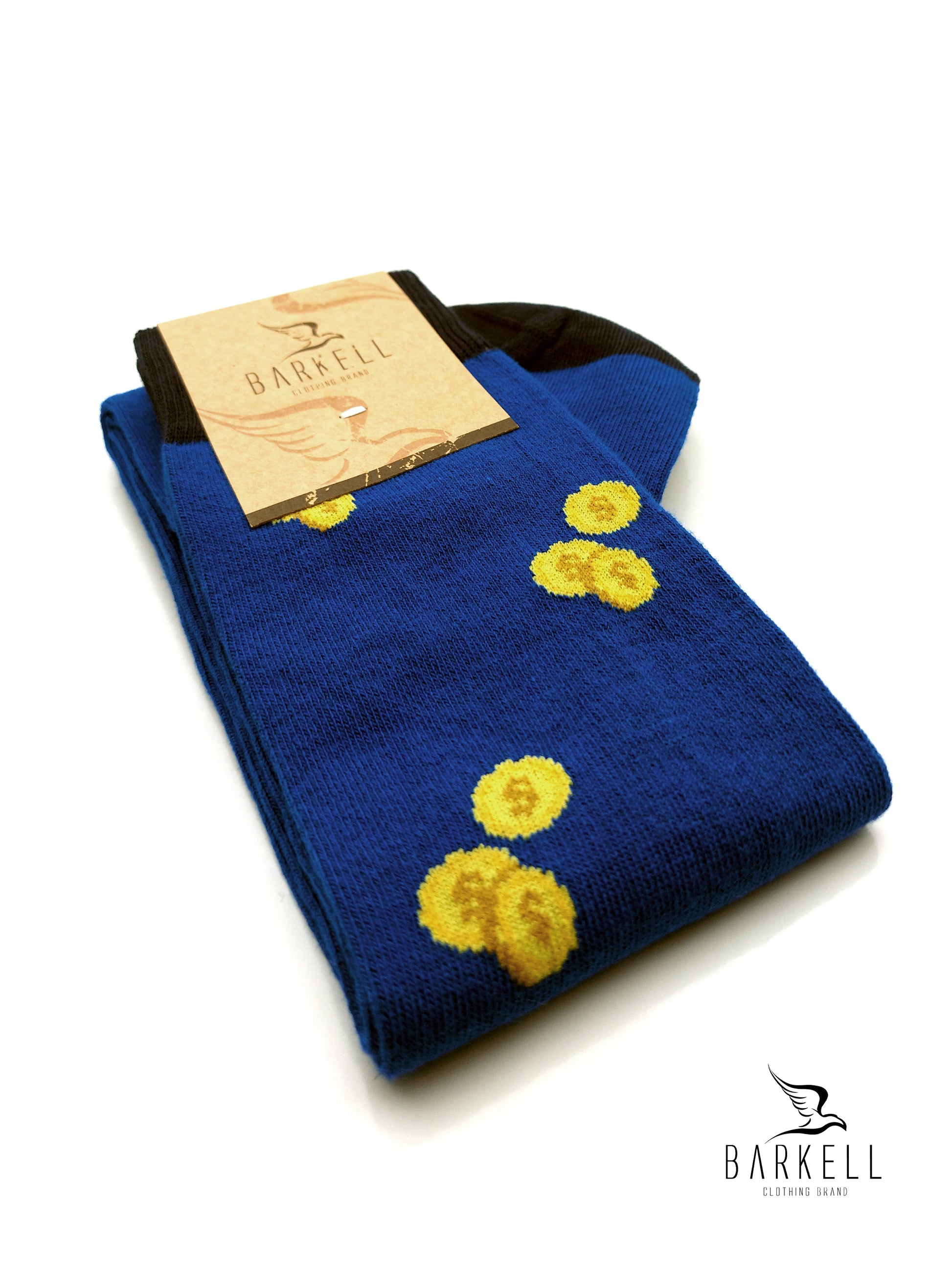 Calza Lunga Sotto il Ginocchio di Alta Qualità Made in Italy in 95% Cotone e 5% Elastan fondo Blu Royal con fantasia Money e Porcellino.