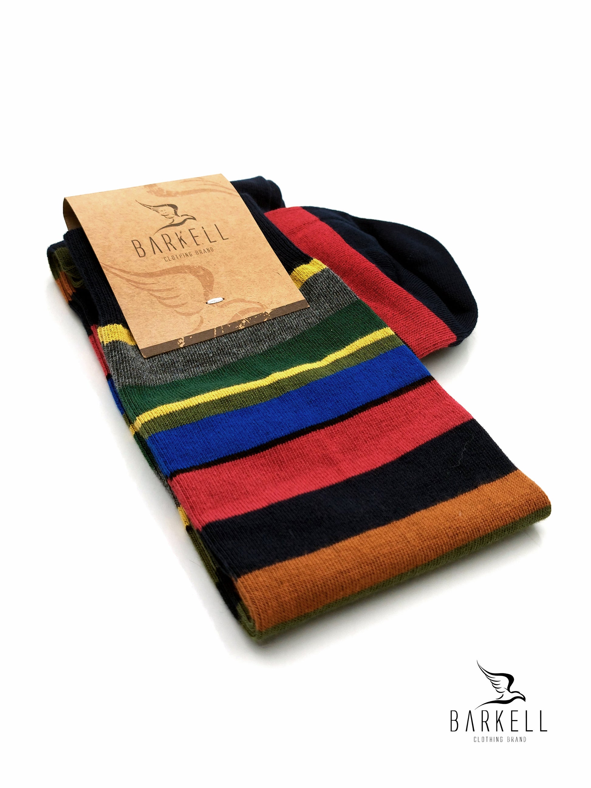 Calza Lunga Sotto il Ginocchio di Alta Qualità Made in Italy in 95% Cotone e 5% Elastan fondo Blu con fantasia Rigata Multicolore.