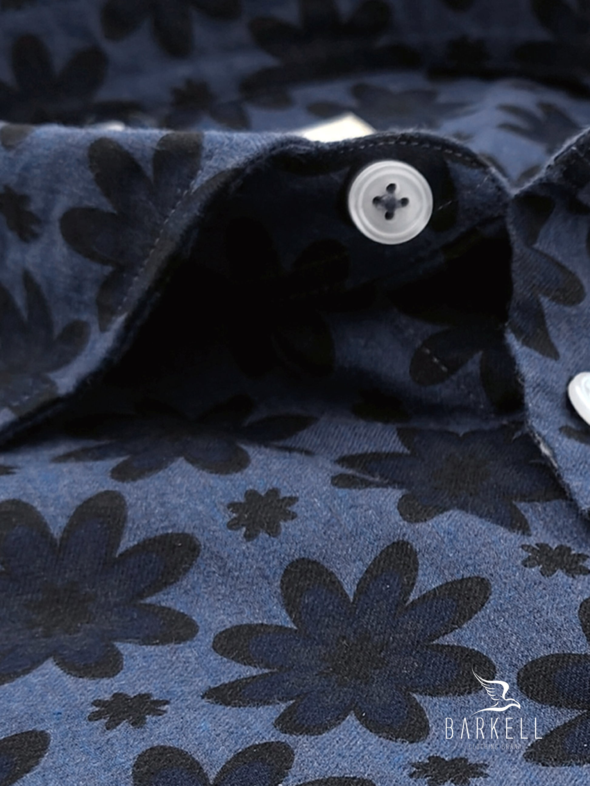 Camicia Fantasia Fiore Blu su Fondo Blu indaco Effetto Denim realizzata in Tessuto Twill 100% Cotone e Lavata in Capo per darle un piacevole effetto naturalmente vissuto.