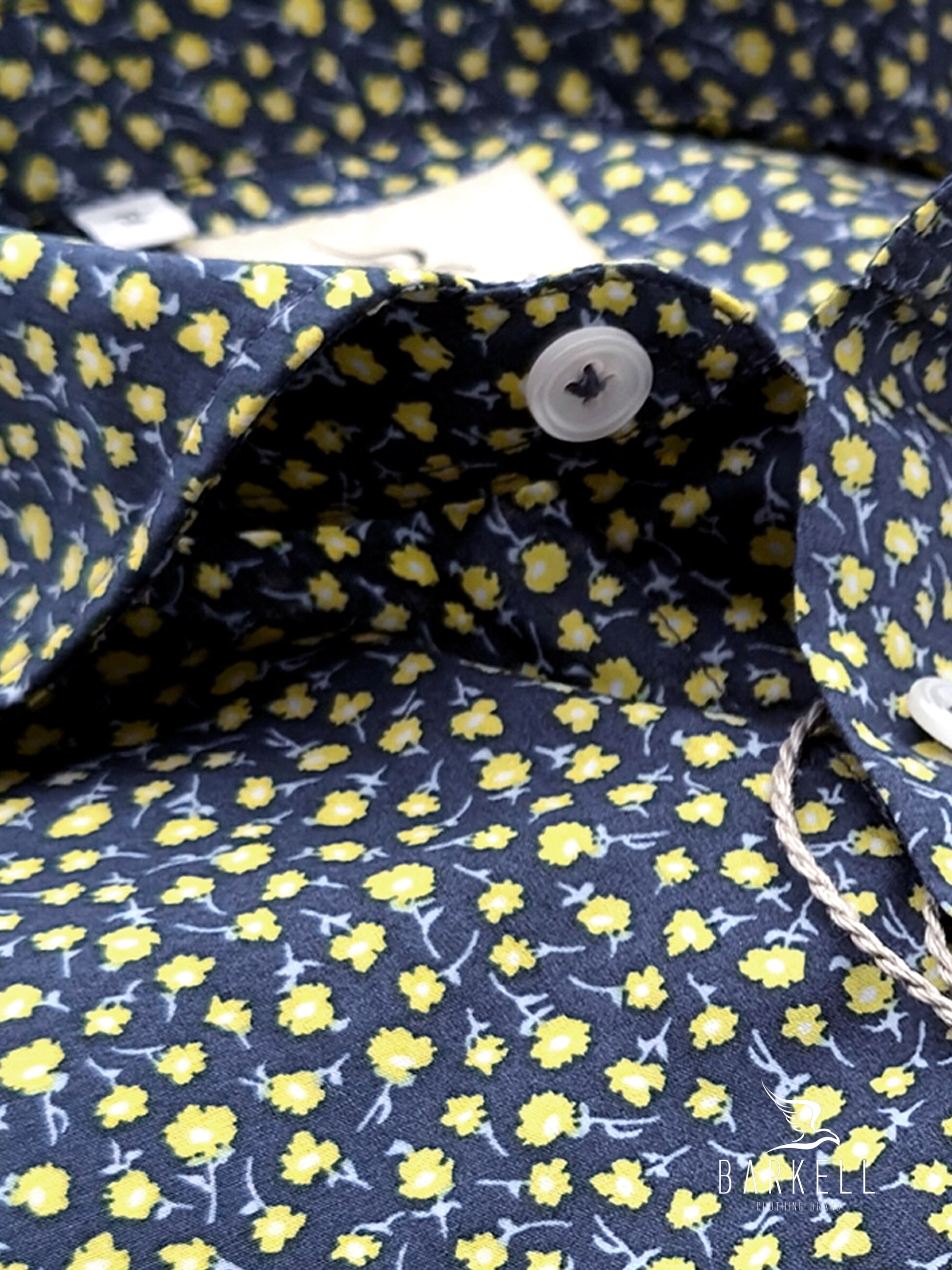 Camicia Fantasia Fiorellini Celesti e Gialli su Fondo Blu Petrolio realizzata in Tessuto Popeline 100% Cotone e Lavata in Capo per darle un piacevole effetto naturalmente vissuto.