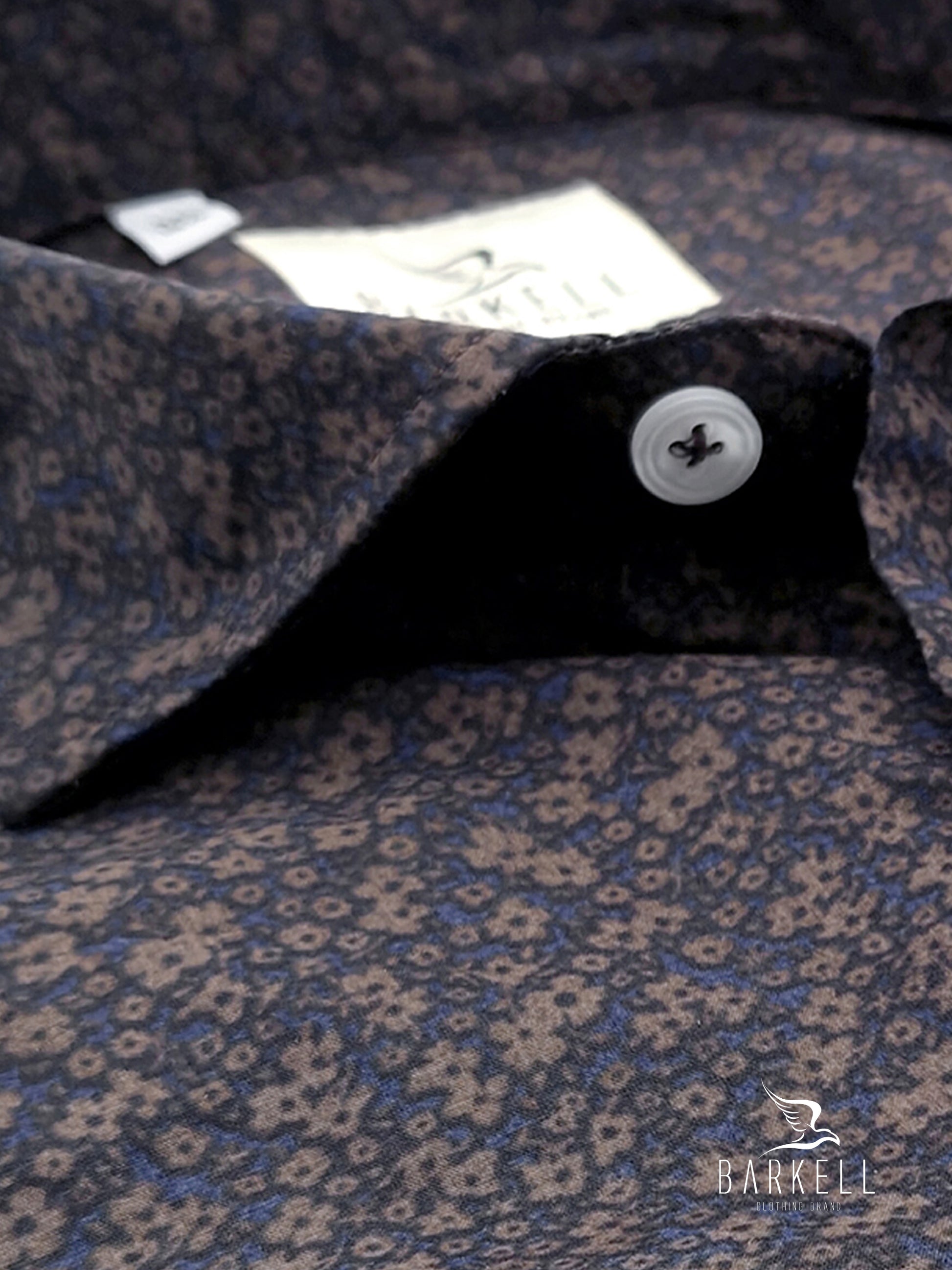 Camicia Fantasia Fiorellini Marroni su Fondo Blu realizzata in Tessuto Popeline 100% Cotone e Lavata in Capo per darle un piacevole effetto naturalmente vissuto.
