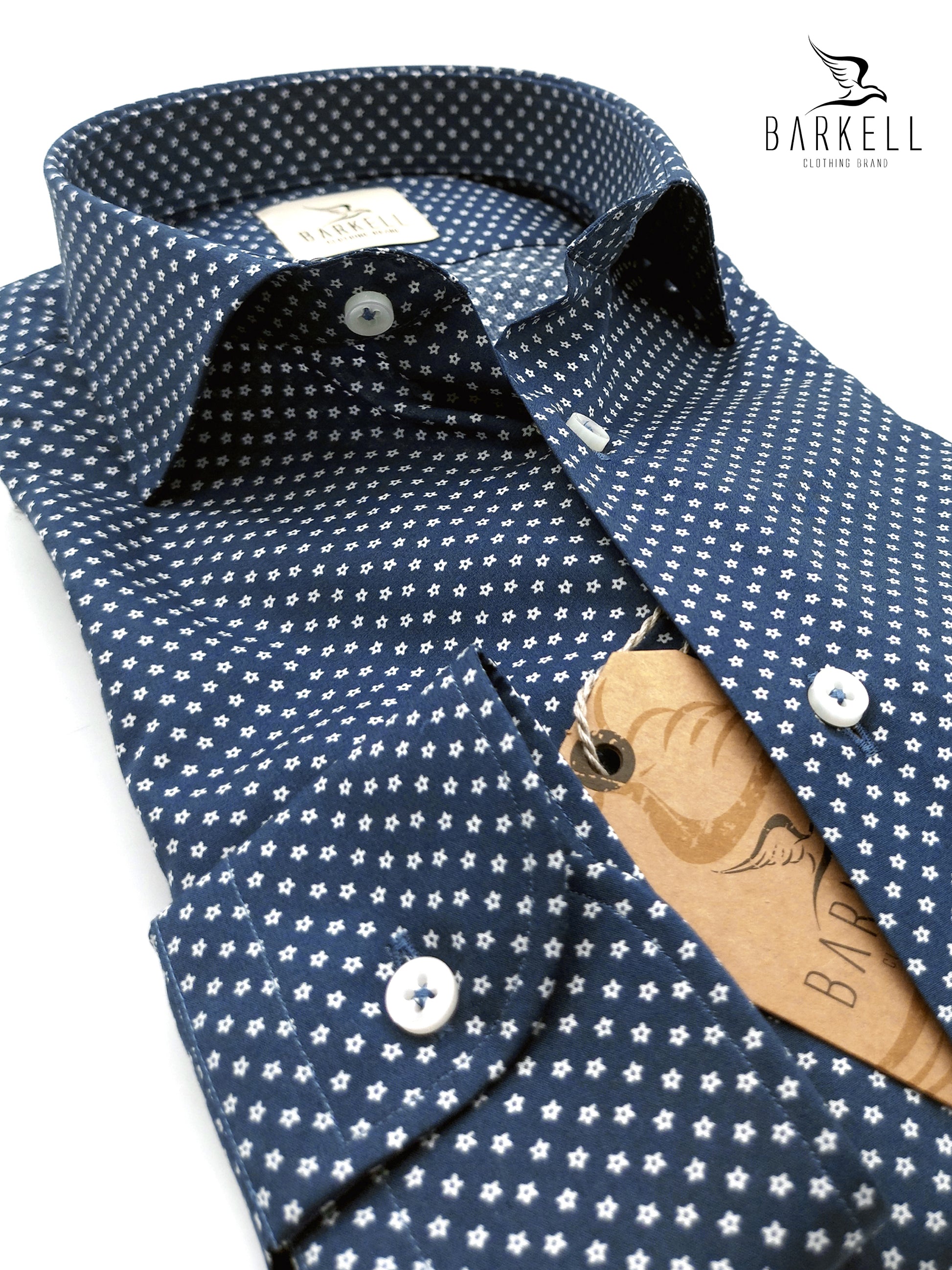 Camicia Fantasia Fiorellino Bianco su Fondo Blu realizzata in Tessuto Popeline 100% Cotone.