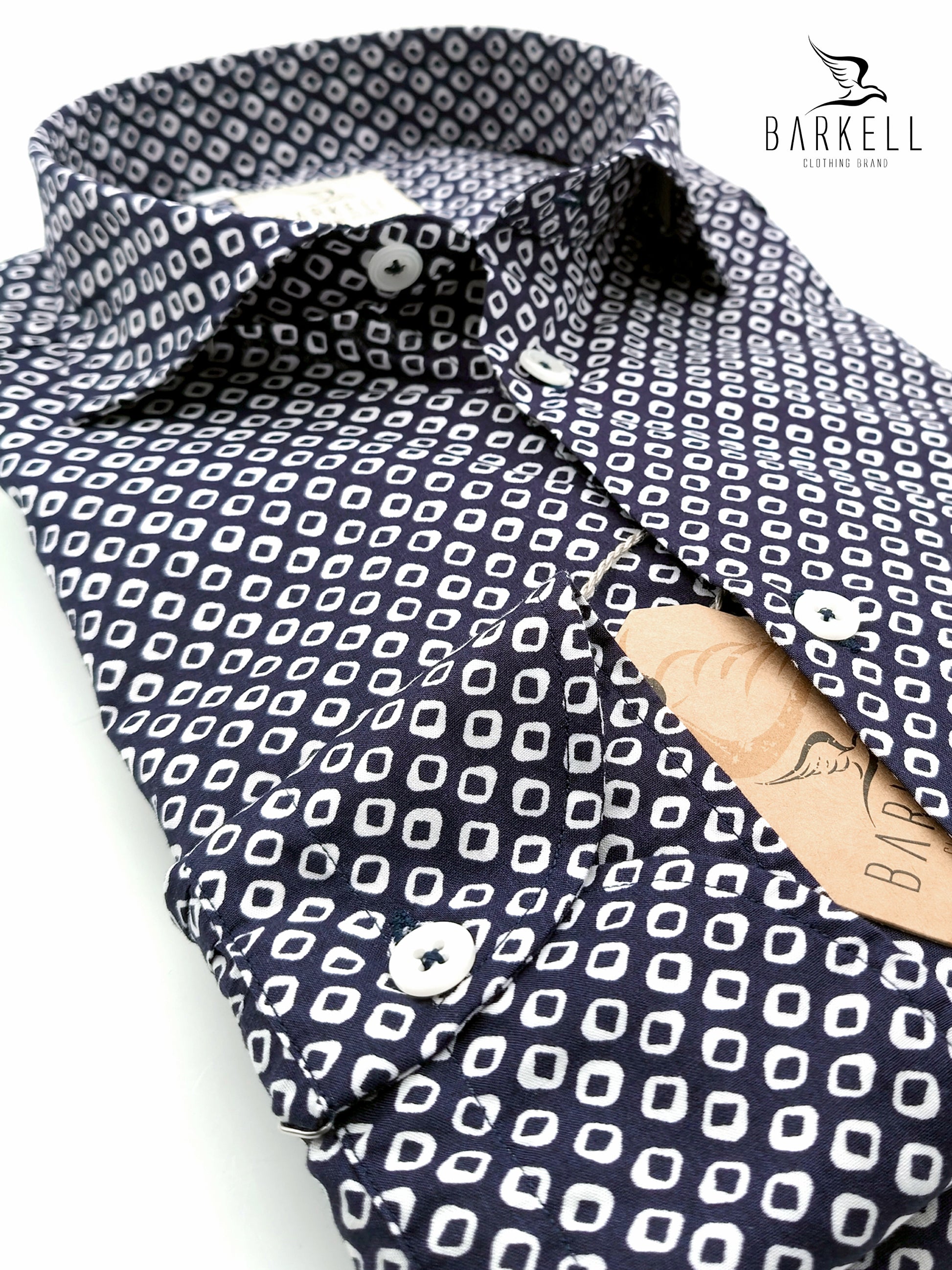 Camicia Fantasia Geometrica Bianca su Fondo Blu realizzata in Tessuto Popeline 100% Cotone e Lavata in Capo per darle un piacevole effetto naturalmente vissuto.