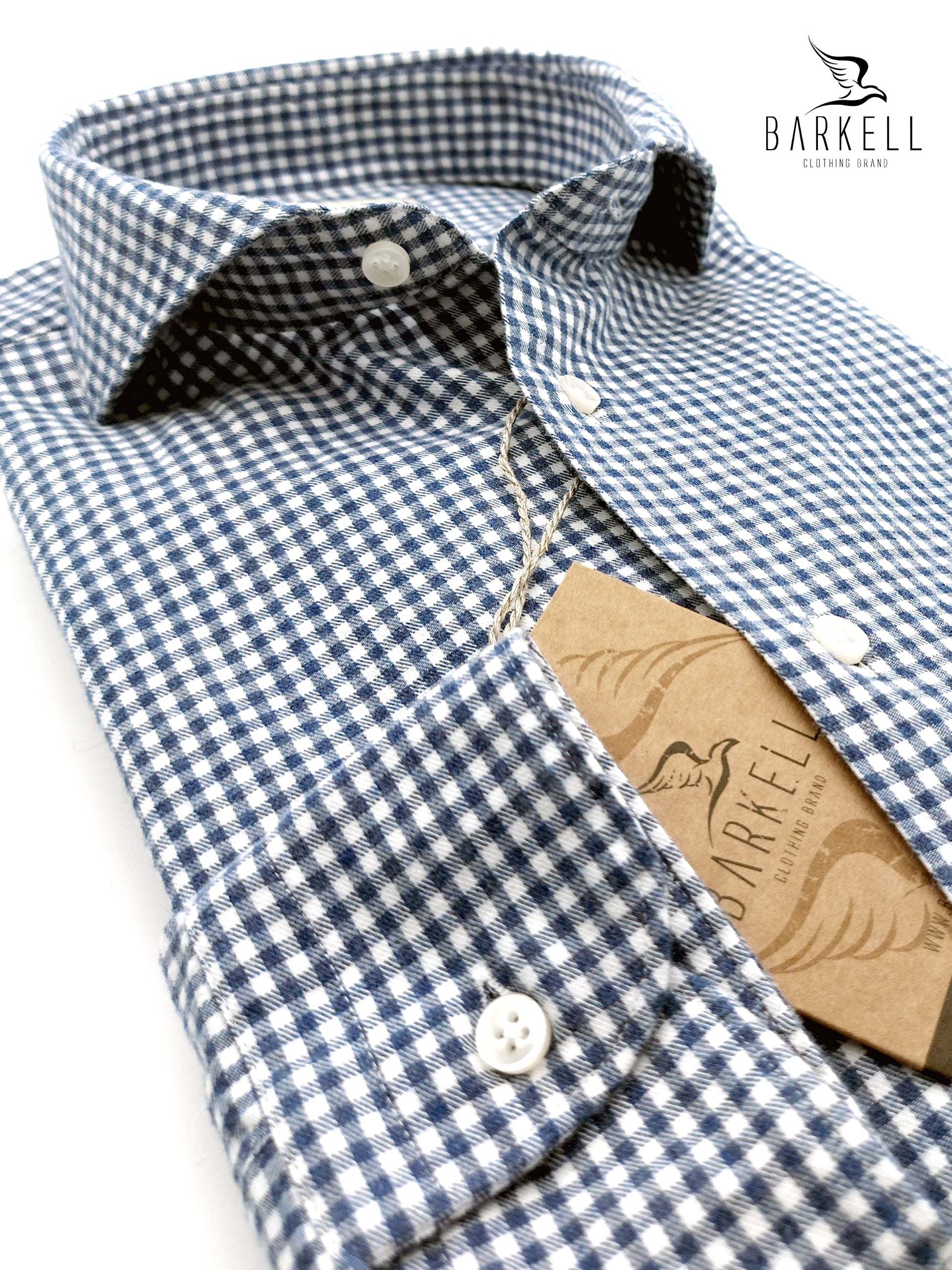 Camicia in Cotone Flanellato Quadretto Blu Denim Fondo Bianco Collo Francese Cutaway